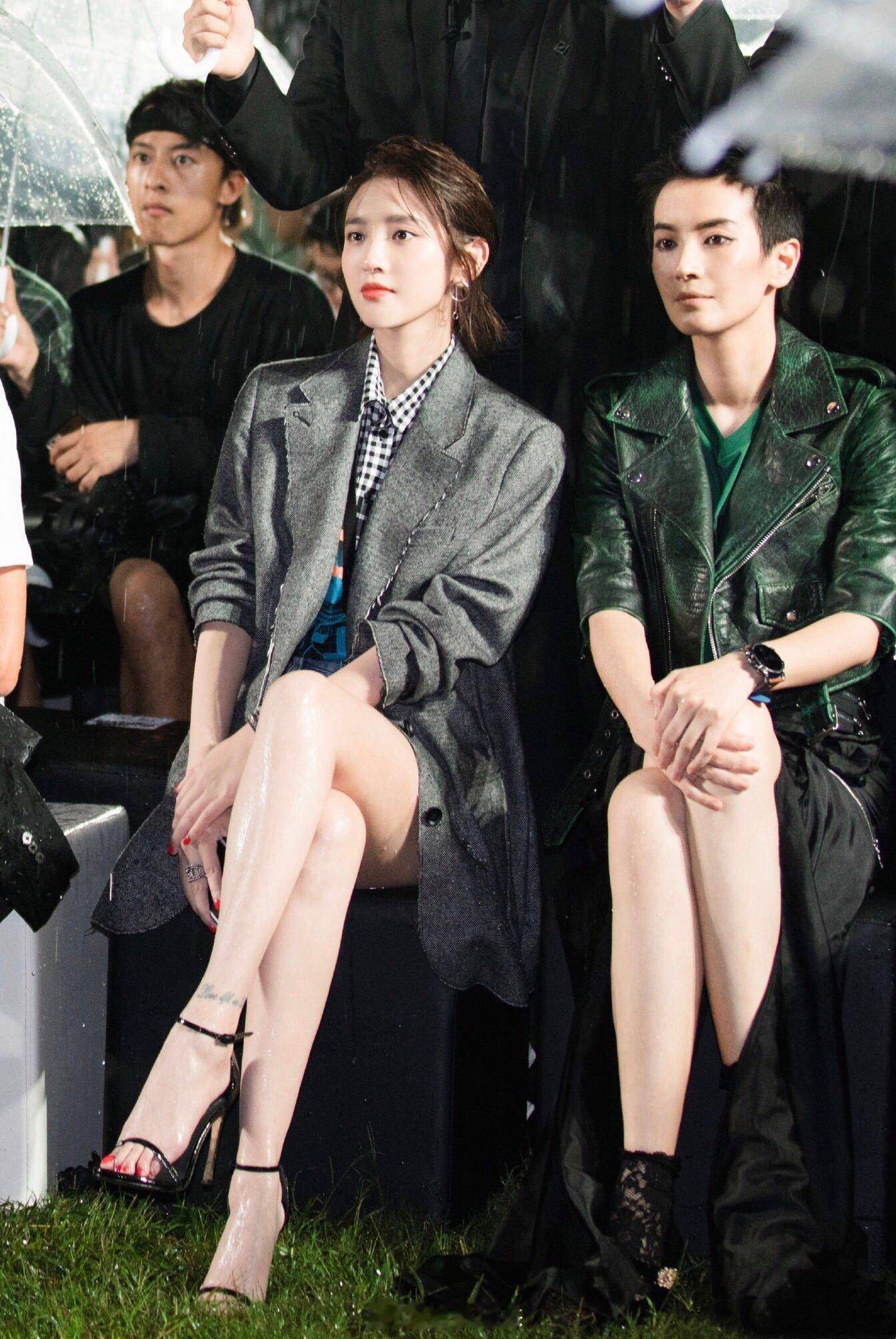 其实冷白皮穿黑白的秘诀,早在她们的私服里藏着呢。李小冉的Oversize灰条纹西装里搭白背心,宽松版型反而突出皮肤的细腻;唐艺昕用蓝白条纹Polo衫配黑百褶裙,学院风里透着少女感。就连两人同框的路透图,一个穿白开衫一个穿黑T恤,站在一起像莫兰迪色卡成了精,冷白皮的清透感把基础色穿出了高定既视感。